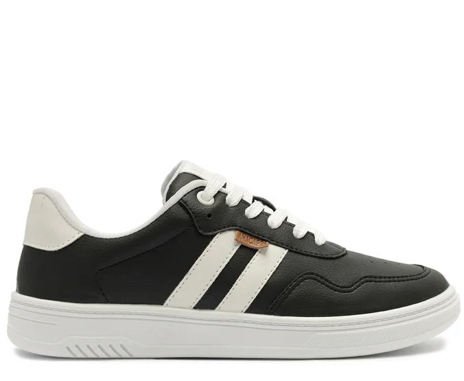 Tênis Lua com detalhe em listra dupla, na cor preta. O modelo traz o shape clássico do tênis Smart A, totalmente repaginado para a temporada de inverno Anacapri. De material similar ao couro, apresenta detalhe em costura pespontada imponente no contorno da biqueira, pontilhado nas laterais e perfuros na parte superior, proporcionando respirabilidade para o tênis. Apresenta duas listras laterais contrastantes em branco, com aplicação de peça traseira no mesmo tom das listras. Possui detalhe moderno e texturizado com design no solado, proporcionando maior conforto e estabilidade no calce. De amarração por atacadores, traz assinatura Anacapri na palmilha, tag marrom lateral e etiqueta emborrachada Anacapri na lingueta.