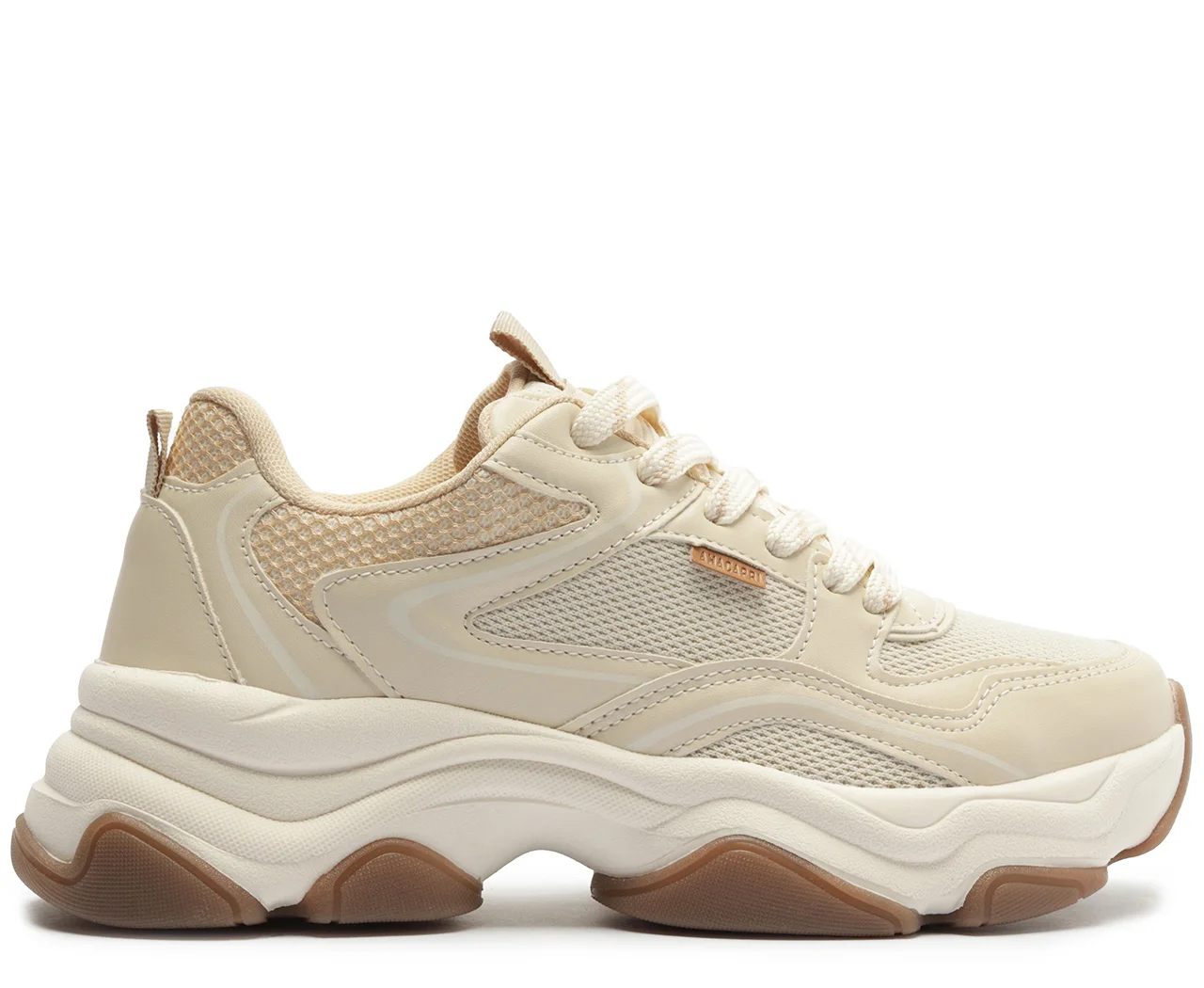 Tênis chunky Alexa, em branco e bege. Com design de recortes modernos, possui aplicação de peças em napa nos tons de bege na biqueira, lingueta, laterais e calcanhar, com acabamento em pesponto delicado nos contornos. Traz atacadores bicolores e cabedal em tecido de nylon e tela smash. O cabedal telado proporciona maior respirabilidade para o tênis. Com novo solado chunky robusto e tecnológico branco com detalhes em marrom. Traz puxadores em fita de gorgurão aplicados na lingueta e na parte traseira, facilitando o calce. Tag marrom lateral com assinatura Anacapri.