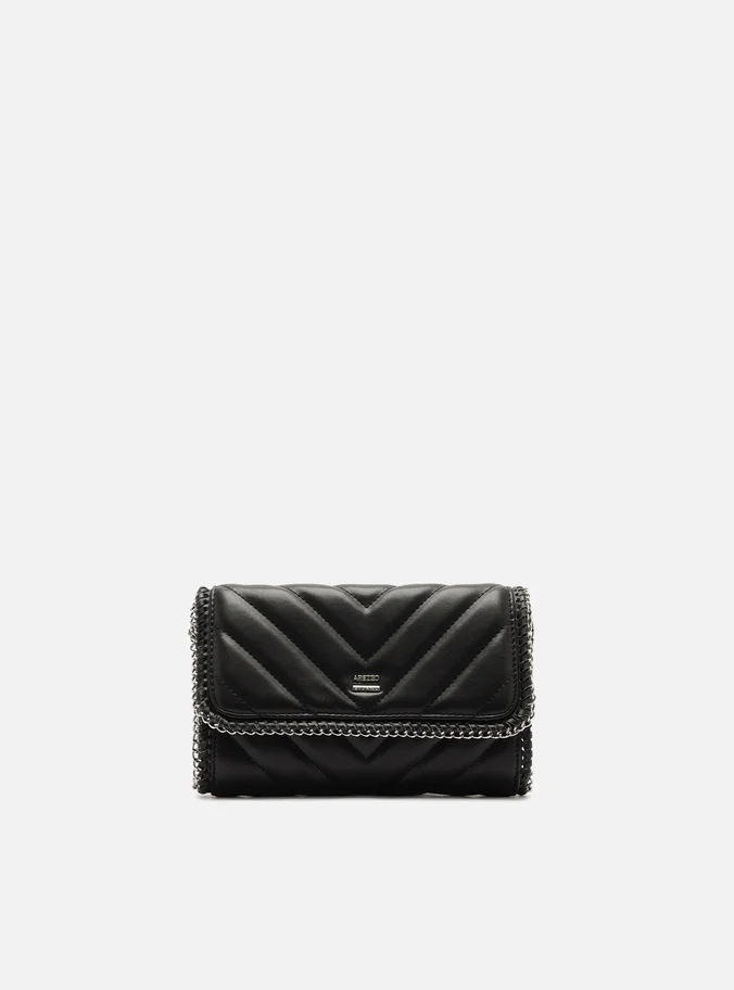 Bolsa tiracolo pequena preta. O acessório tem formato estruturado e retangular e costuras em matelassê. Traz alça em corrente metálica, presa à bolsa. Possui fecho em tampo frontal e peça metálica com inscrição do nome da marca na capa.