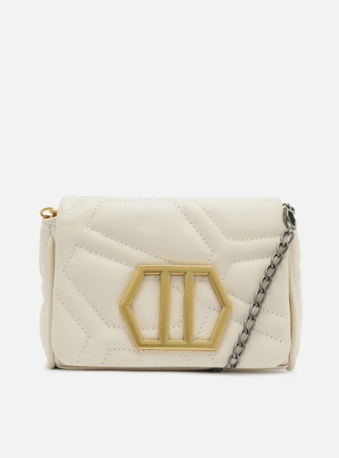 Descrição:Bolsa mini bag de couro branca. O modelo tem formato compacto, quadrado e estruturado, capas com costuras em matelassê geométricas bombadas e aplicação metálica dourada, geométrica e vazada na capa frontal. Traz alça em corrente metálica, presa por metais sextavados nas laterais. Possui fecho em tampo frontal e imã interno.
