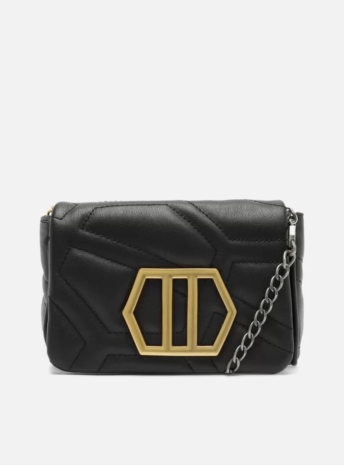 Descrição: Bolsa mini bag de couro preta. O modelo tem formato compacto, quadrado e estruturado, capas com costuras em matelassê geométricas bombadas e aplicação metálica dourada, geométrica e vazada na capa frontal. Traz alça em corrente metálica, presa por metais sextavados nas laterais. Possui fecho em tampo frontal e imã interno.