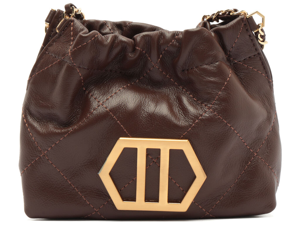 Descrição:Bolsa tiracolo pequena em couro Coffe. O acessório tem formato macio e capas com costuras em matelassê. Traz alça em corrente metálica dupla com tiras de couro entrelaçadas e detalhe em elos hexagonais, além de corrente simples com pingente. Possui borda superior franzida, com alça que passa por dentro, e fecho em imã interno. Com peça de metal, dourada, geométrica e vazada aplicada na capa.