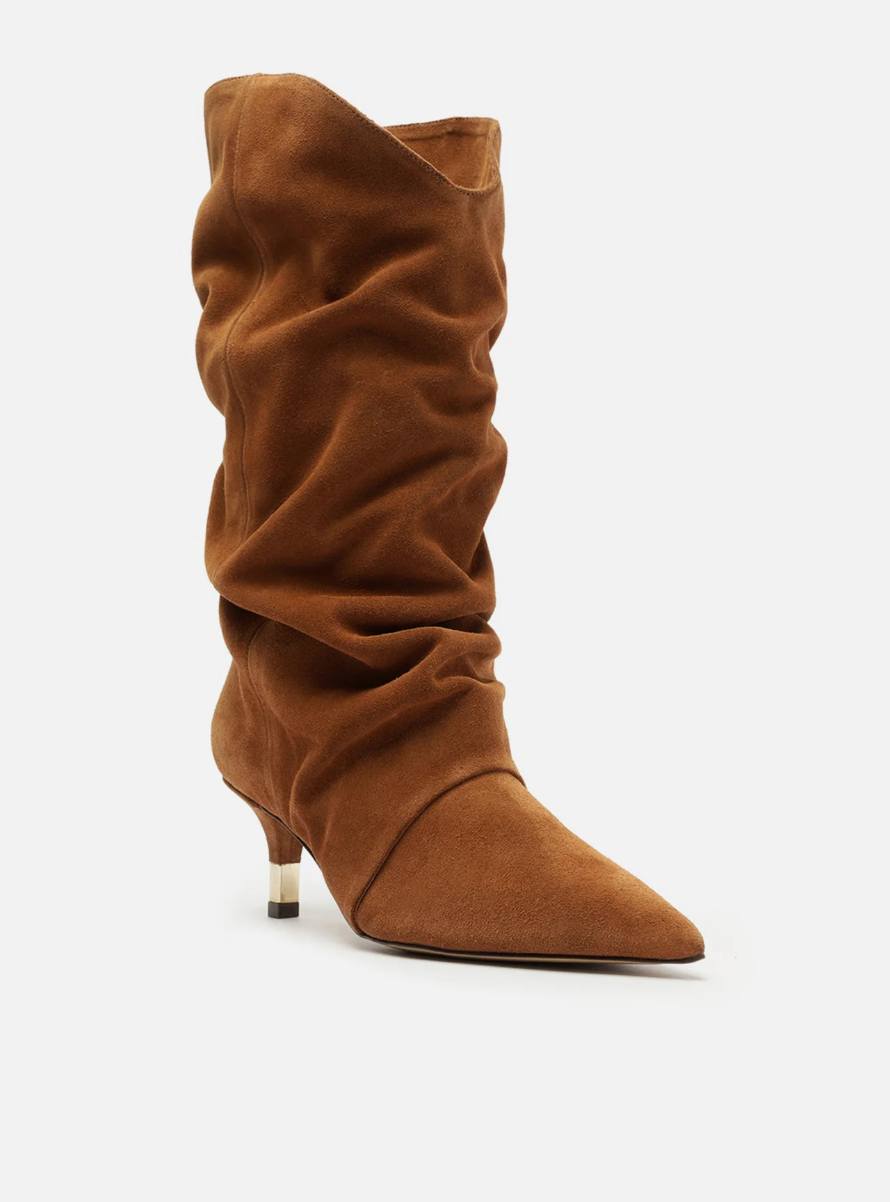 Descrição:Bota feminina marrom em camurça. O sapato tem cano médio, salto médio fino com detalhe metálico e ponta fina. Traz cano com efeito amassado e recorte no topo. Não possui fechamento.