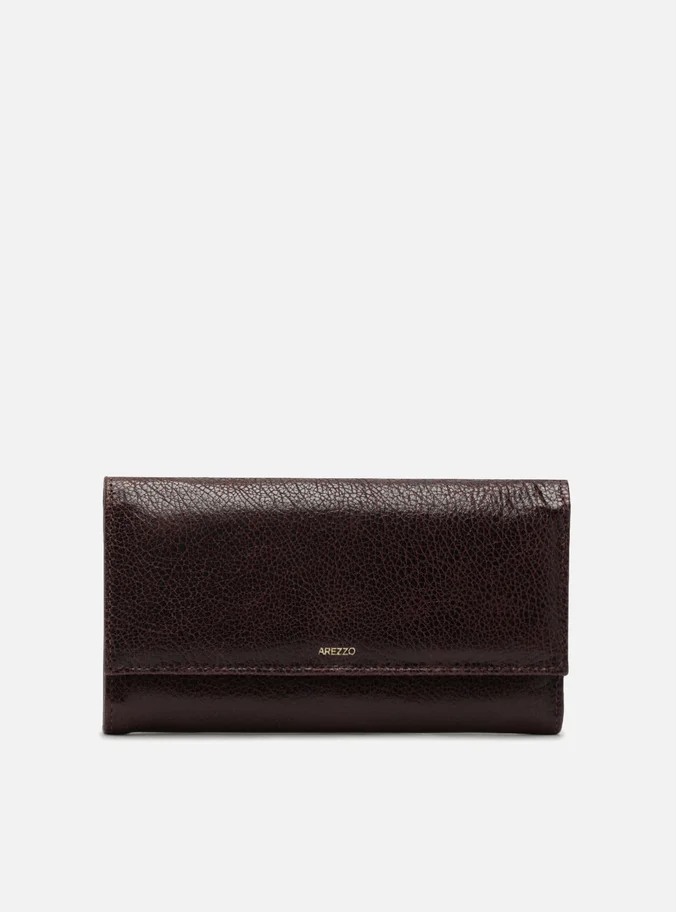 Carteira feminina grande de couro marrom com acabamento desgastado. O acessório tem formato retangular e fecho por aba com botão interno. Possui parte interna com divisórias para cartões e notas, além de bolso para moedas com zíper. Com inscrição do nome da marca na parte frontal.