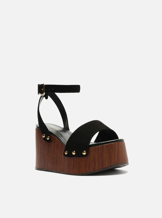 Descrição: Sandália feminina preta acamurçada. O sapato tem salto alto plataforma e formato arredondado na ponta. Traz sola amadeirada e tira larga sobre os dedos, com aplicação de rebites nas laterais. Possui tiras que saem das laterais, cruzam na parte traseira, contornam o tornozelo e fecham em fivela lateral. Com palmilha em couro liso e inscrição do nome da marca. Peça metálica aplicada na parte traseira da sola.