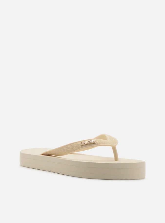 Descrição: Chinelo feminino branco. O sapato tem salto baixo flatform em borracha e palmilha texturizada com inscrição do nome da marca. Com formato arredondado na ponta, traz tiras finas injetadas que dividem os dedos, com aplicação metálica Brizza em uma delas. Aberto, o chinelo de dedo exibe todo o pé.