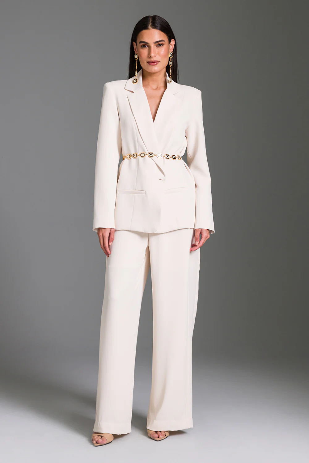a calça fluída possui cós duplo com fechamento frontal por caseado e botão e elástico interno no cós traseiro. zíper encoberto na braga, recortes laterais e pences traseiras também completam a peça. barra em bainha finaliza o visual contemporâneo e estruturado.