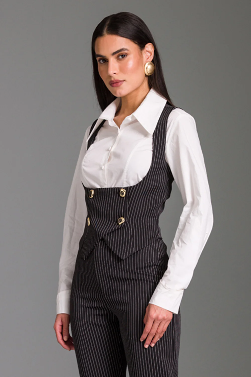 Camisa ajustada lisa com recortes: gola dupla com pontas alongadas e pé de gola com botão aplicado. a frente possui recortes pespontados e abertura central com vista invisível fechada por caseados e botões. mangas longas com pregas na parte inferior, punhos assimétricos, elos e botões complementam o acabamento. modelagem ajustada que valoriza a silhueta. barra em bainha, conferindo um toque moderno e sofisticado à peça.