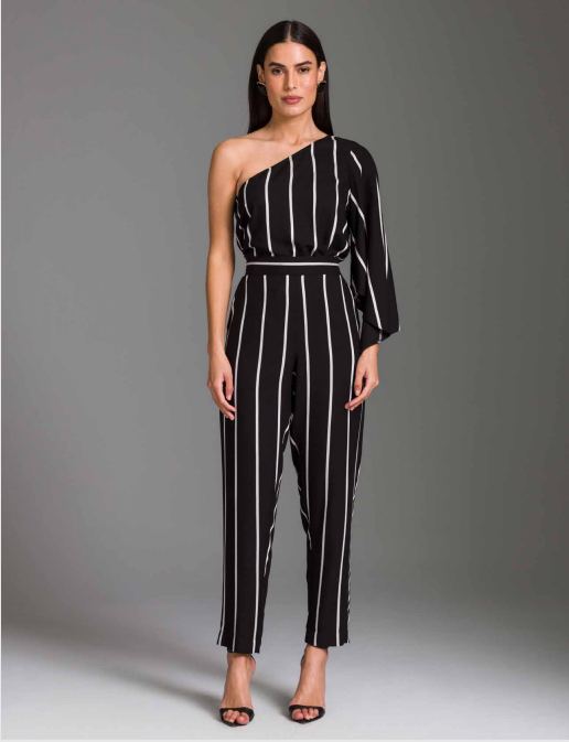 Conjunto feminino sofisticado composto por blusa de um ombro só e calça de modelagem reta, confeccionado em tecido leve com estampa de listras verticais que alongam a silhueta. A blusa possui design assimétrico com manga longa fluida, trazendo modernidade e elegância ao look. A calça de cintura alta apresenta caimento impecável, valorizando o corpo com conforto e estilo. Um conjunto versátil e marcante, ideal para ocasiões especiais ou produções fashionistas com toque contemporâneo.