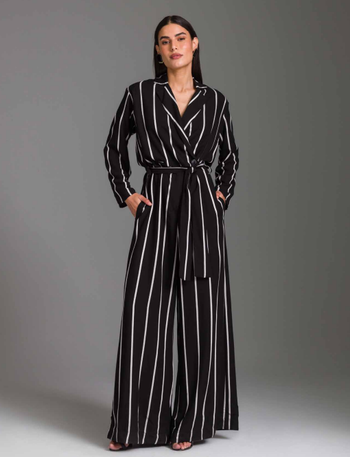Macacão longo confeccionado em tecido leve com padronagem de listras verticais, que alonga a silhueta e traz elegância ao visual. Possui decote transpassado em V e mangas longas, garantindo um caimento sofisticado. Acompanha faixa para amarração na cintura, permitindo ajuste perfeito ao corpo e valorizando a silhueta. Conta ainda com bolsos laterais funcionais e modelagem ampla nas pernas, proporcionando conforto e movimento. Uma peça moderna e versátil, ideal para composições elegantes em diversas ocasiões. ✨