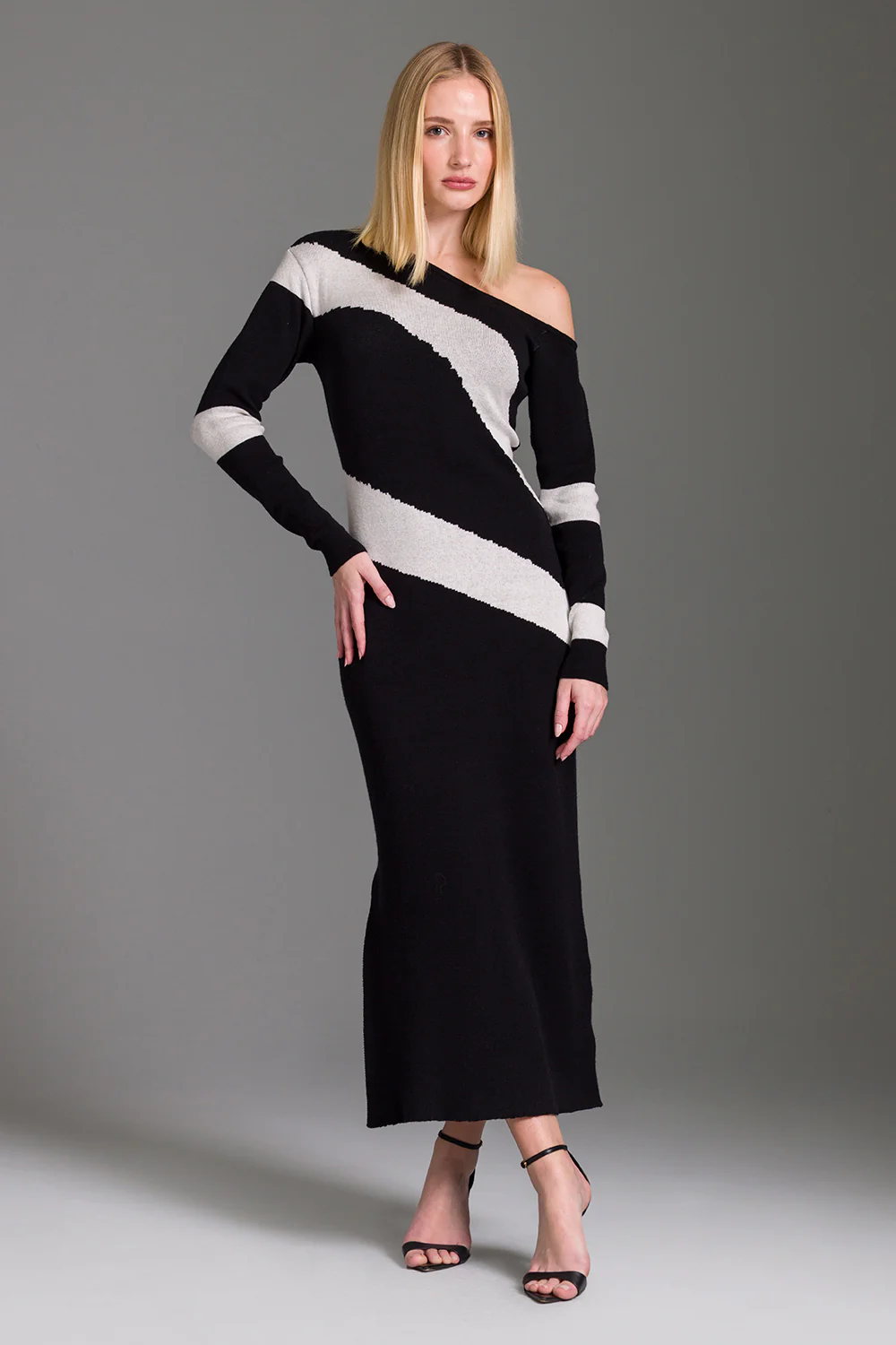 Vestido super midi bicolor: modelo com decote assimétrico que deixa um ombro à mostra, adicionando sofisticação e modernidade ao visual. a modelagem justa ao corpo valoriza as formas femininas, enquanto a estampa bicolor diferenciada traz impacto ao design. a fenda lateral na barra proporciona movimento e sensualidade na medida certa.