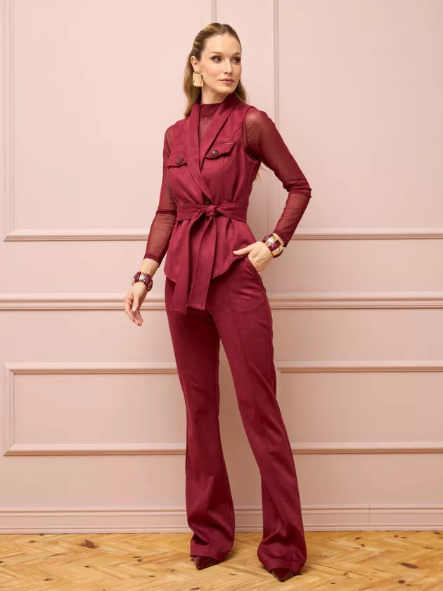 A Calça Flare impressiona pelo toque macio do suede e pela sua modelagem impecável, que equilibra conforto e elegância. Seus recortes frontais e traseiros foram pensados para alongar a silhueta com naturalidade, criando um visual moderno e refinado. Os bolsos funcionais e o fechamento interno com colchetes de alfaiataria reforçam o cuidado nos detalhes e elevam o acabamento da peça. Versátil e cheia de presença, a calça combina perfeitamente com camisas elegantes, tricôs ajustados ou tops estruturados. Harmonize com botas de salto ou sandálias delicadas e descubra produções que transitam com facilidade do dia à noite, sempre com charme e conforto.