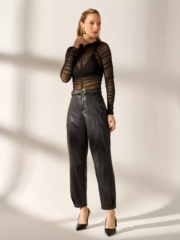 Feita para quem ama unir força e elegância, a calça traz uma modelagem reta impecável que alonga a silhueta com naturalidade. Os recortes estratégicos valorizam o design, criando linhas modernas e cheias de personalidade, enquanto o botão interno reforça o acabamento sofisticado. Confeccionada em PU Premium, ela entrega estrutura, conforto e aquele brilho discreto que eleva instantaneamente qualquer produção. Versátil e marcante, a calça combina perfeitamente com camisas refinadas, tricôs ajustados ou blusas de renda para um contraste atual. Use com botas, scarpins ou sandálias de tiras e transforme seu visual — do casual chic ao elegante moderno — com um único movimento.