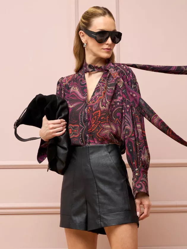 A Camisa Gola Laço Paisley é a perfeita tradução de feminilidade sofisticada. Confeccionada em crepe fluido, ela apresenta um caimento leve e elegante, acompanhado de um decote em V que alonga a silhueta com suavidade. O grande destaque está na gola versátil, que pode ser usada como laço ou cachecol, criando diferentes atmosferas — do romântico delicado ao moderno refinado. Sua estampa exclusiva, desenvolvida nas cores da coleção, transforma a peça em um elemento versátil, pensado para dialogar com múltiplas combinações. Perfeita para elevar looks do dia a dia ou composições mais elaboradas, a camisa harmoniza lindamente com alfaiataria para um visual elegante, com saias fluídas para um toque feminino ou até com jeans para um contraste moderno e cheio de charme. Uma peça única, criada para acompanhar você com sofisticação em cada detalhe.