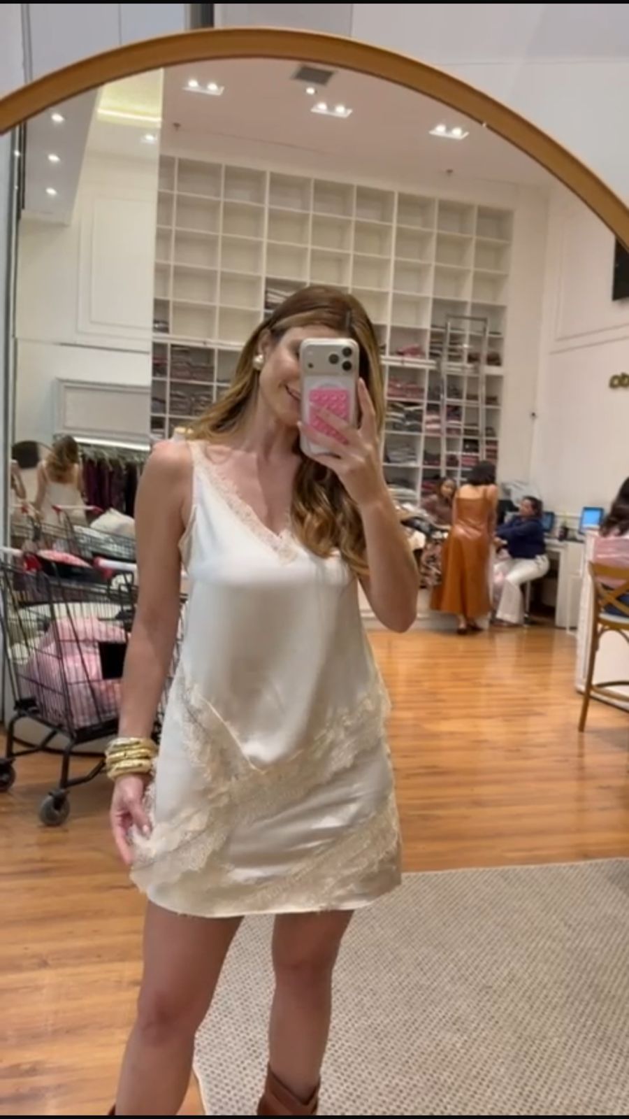 Saia feminina curta confeccionada em tecido acetinado, que proporciona brilho suave e um caimento elegante. O modelo possui detalhe em renda, trazendo um toque delicado e sofisticado à peça.