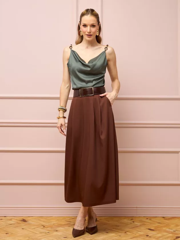 A Saia Midi combina o caimento preciso da alfaiataria two way com uma construção impecável que valoriza a silhueta de forma natural. O cós largo proporciona estrutura e elegância, enquanto as pregas frontais criam um movimento leve e sofisticado. A modelagem evasê reforça a fluidez da peça, trazendo um charme atemporal que equilibra delicadeza e presença. Versátil e refinada, a saia harmoniza com camisas estruturadas para um visual elegante, blusas leves para uma proposta feminina ou tricôs ajustados para um look moderno. Aposte em scarpins, botas ou sandálias minimalistas e descubra uma peça que transforma qualquer produção com facilidade.