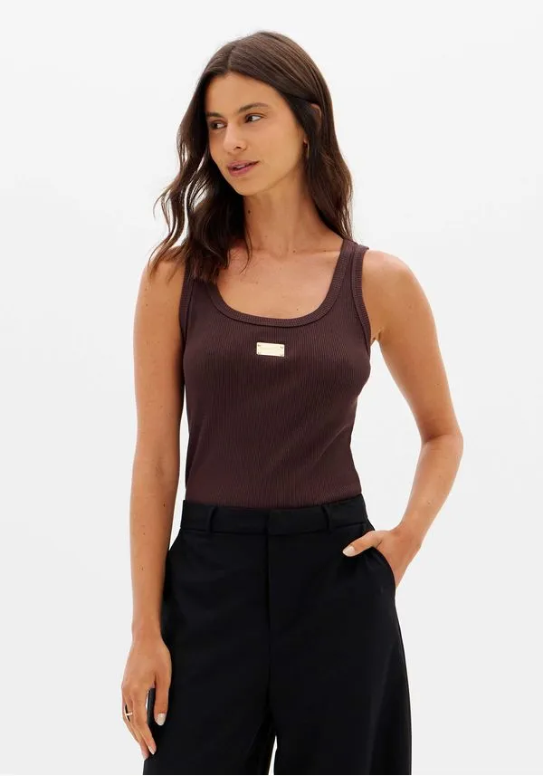 A blusa regata básica confeccionada em malha canelada exibe caimento justo ao corpo e decote em u que confere elegância. A placa frontal decorativa em destaque completa o visual com autenticidade e estilo. Essencial para produções casuais!