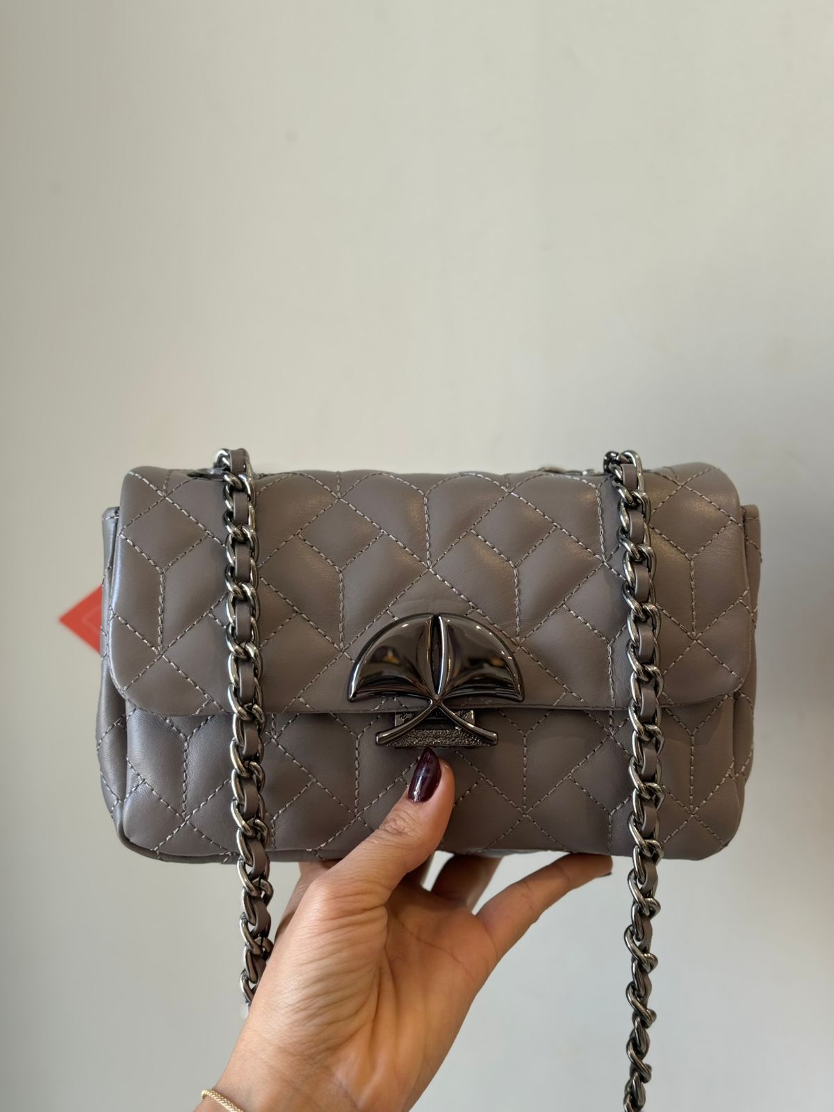 Com design marcante e sofisticado, esta bolsa pequena em couro café aposta na textura acolchoada em padrão geométrico para criar impacto visual e sofisticação. O destaque fica por conta do fecho metálico exclusivo no formato da flor Caliandra, símbolo da marca, com acabamento dourado que reforça a elegância do modelo. A alça em corrente com entrelaçamento em couro permite o uso no ombro ou transpassado, enquanto o tamanho compacto acomoda o essencial com praticidade. Um acessório versátil e elegante que eleva qualquer produção com personalidade.