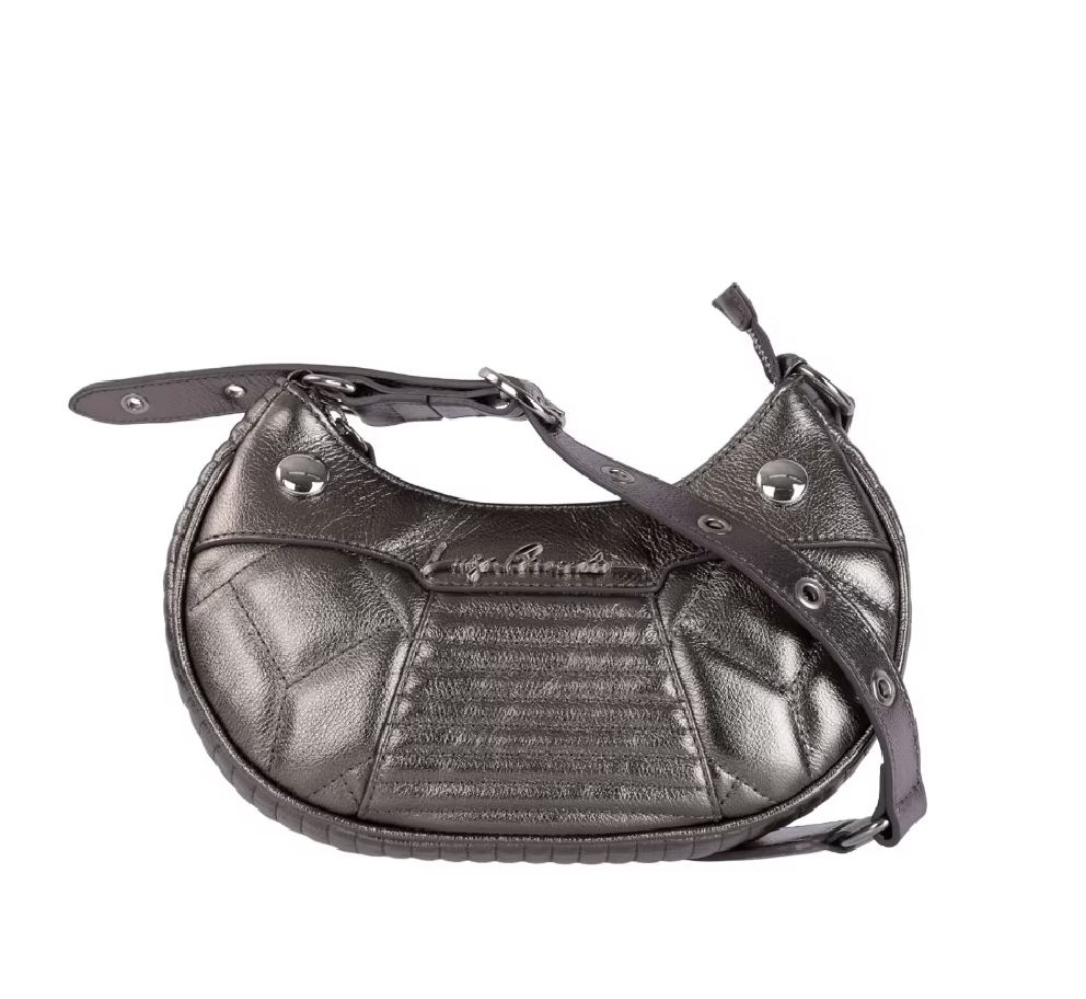 O estilo dessa bolsa Luiza Barcelos vem para esta temporada em tamanho pequeno, shape mais fino, glamuroso e fascinante: O modelo baguete com acabamentos angulares cumpre bem estas funções, focando em materiais macios e monocromia. A bolsa pequena é produzida em couro no tom metalizado chumbo com superfície com recortes em matelassê, possui alça tiracolo ajustável com detalhes de ilhós dourados, um compartimento interno, fechamento por zíper e aplicação frontal de tag da marca metalizada.