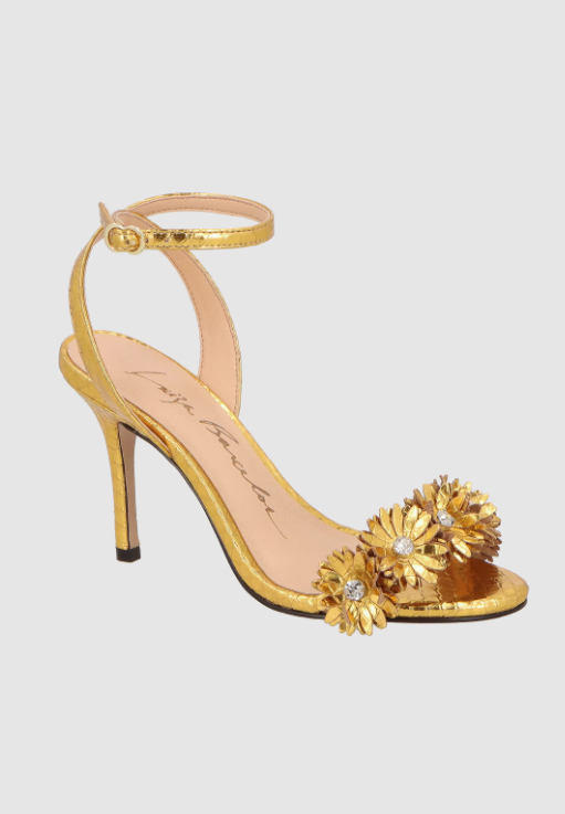 A sandália em couro cobra metalizado no tom de dourado ilumina o visual com sofisticação e um toque artístico. O modelo de salto alto fino traz tira frontal adornada por flores aplicadas com cristais no centro, criando um efeito delicado e ao mesmo tempo impactante. Um calçado que une glamour e modernidade, perfeito para compor produções marcantes com elegância atemporal.