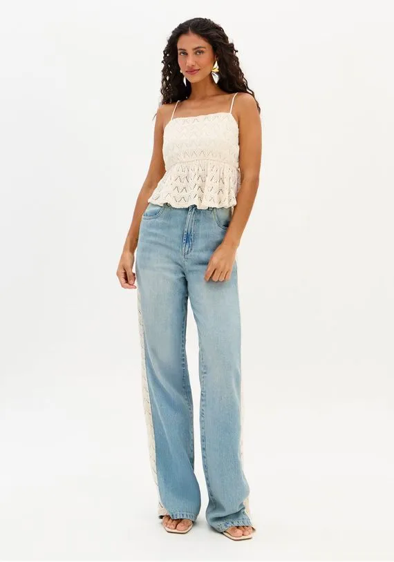 a calça jeans full length ganha uma versão moderna e fashion com aplicação lateral em tricô, que adiciona textura e customização à peça. Com cintura alta, bolsos funcionais e cós com passantes, ela valoriza a silhueta e garante versatilidade no dia a dia.