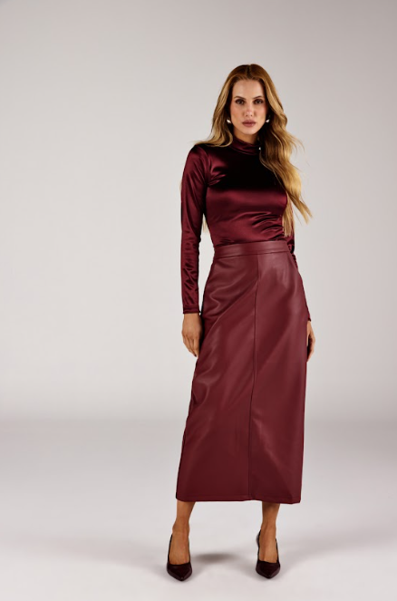 Saia midi em courino com design elegante e contemporâneo, perfeita para composições sofisticadas. Possui comprimento abaixo do joelho e modelagem que valoriza a silhueta, com caimento estruturado e acabamento levemente acetinado