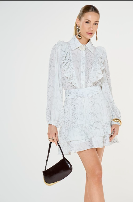 Vestido curto com babados, delicado e cheio de charme. Possui modelagem leve e fluida, que valoriza a silhueta com conforto e feminilidade. Os babados aplicados ao longo da peça trazem movimento e um toque romântico ao visual, enquanto o comprimento curto garante modernidade.