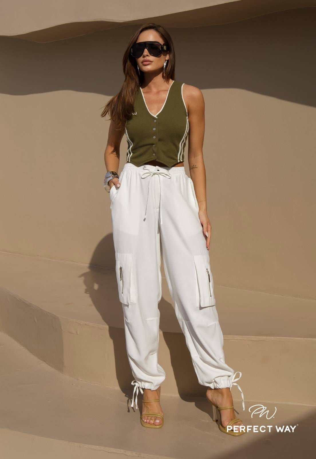 Estilosa e funcional, esta calça jogger feminina une conforto e atitude com seu cós de elástico e recortes modernos. Os bolsos laterais com pala e botões de metal, pregas frontais e colise na barra garantem um visual utilitário sofisticado. Ideal para compor looks urbanos com praticidade e personalidade.