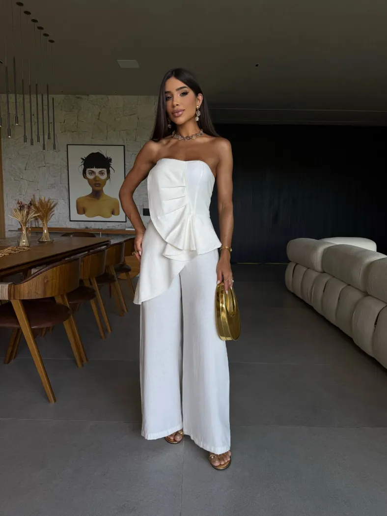 Macacão tomara que caia confeccionado em alfaiataria leve off white.