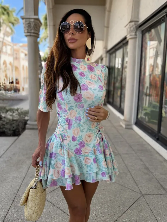 Vestido confeccionado em estampa floral, em delicados tons de verde-água, rosa e laranja.