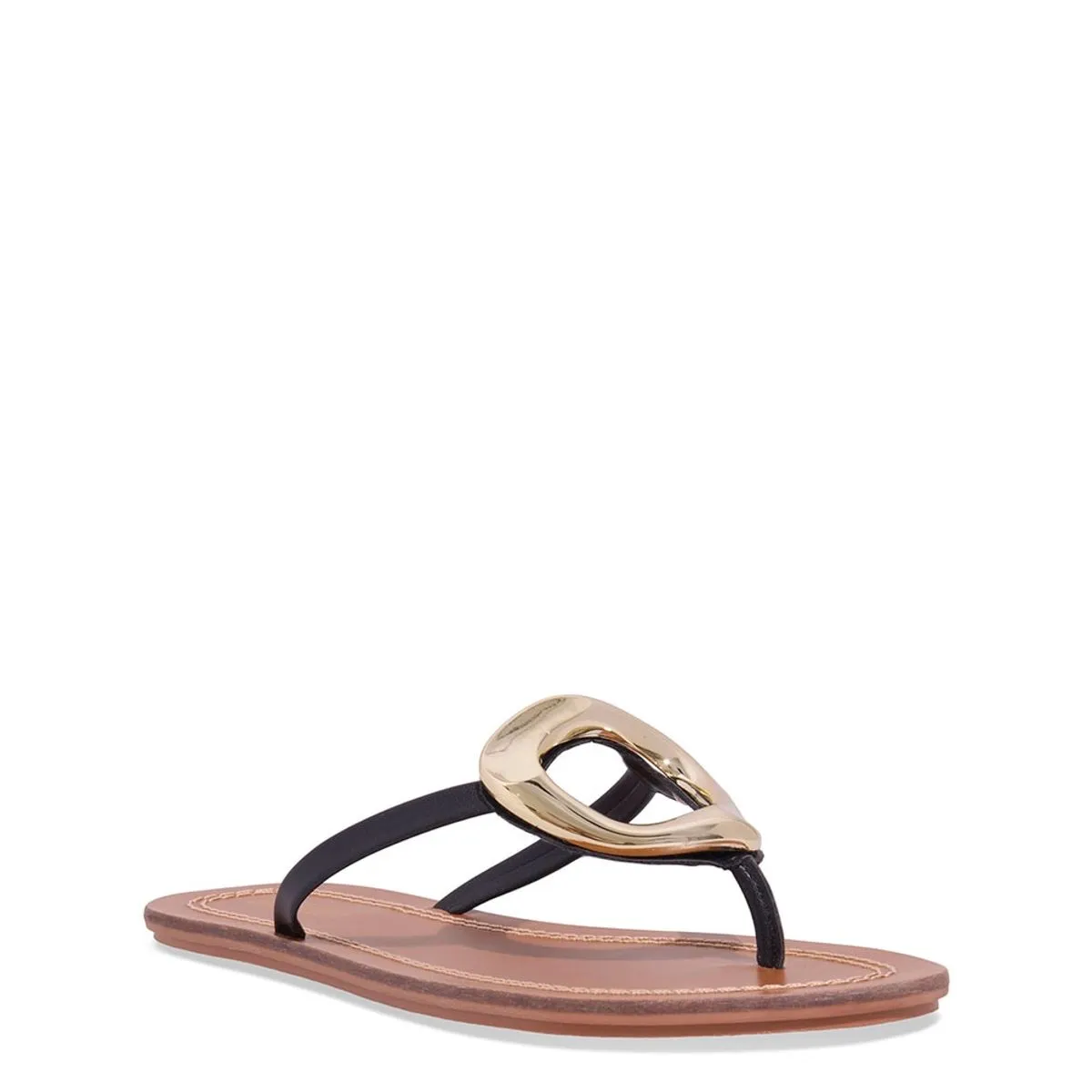Rasteira confeccionada em couro mestiço, garantindo resistência e acabamento sofisticado. O design no estilo thong apresenta tiras finas e aplicação de peça metálica central, que adiciona charme e modernidade ao visual. Possui palmilha com pespontos aparentes, reforçando a durabilidade e proporcionando conforto ao caminhar. Ideal para compor looks casuais com praticidade e elegância.