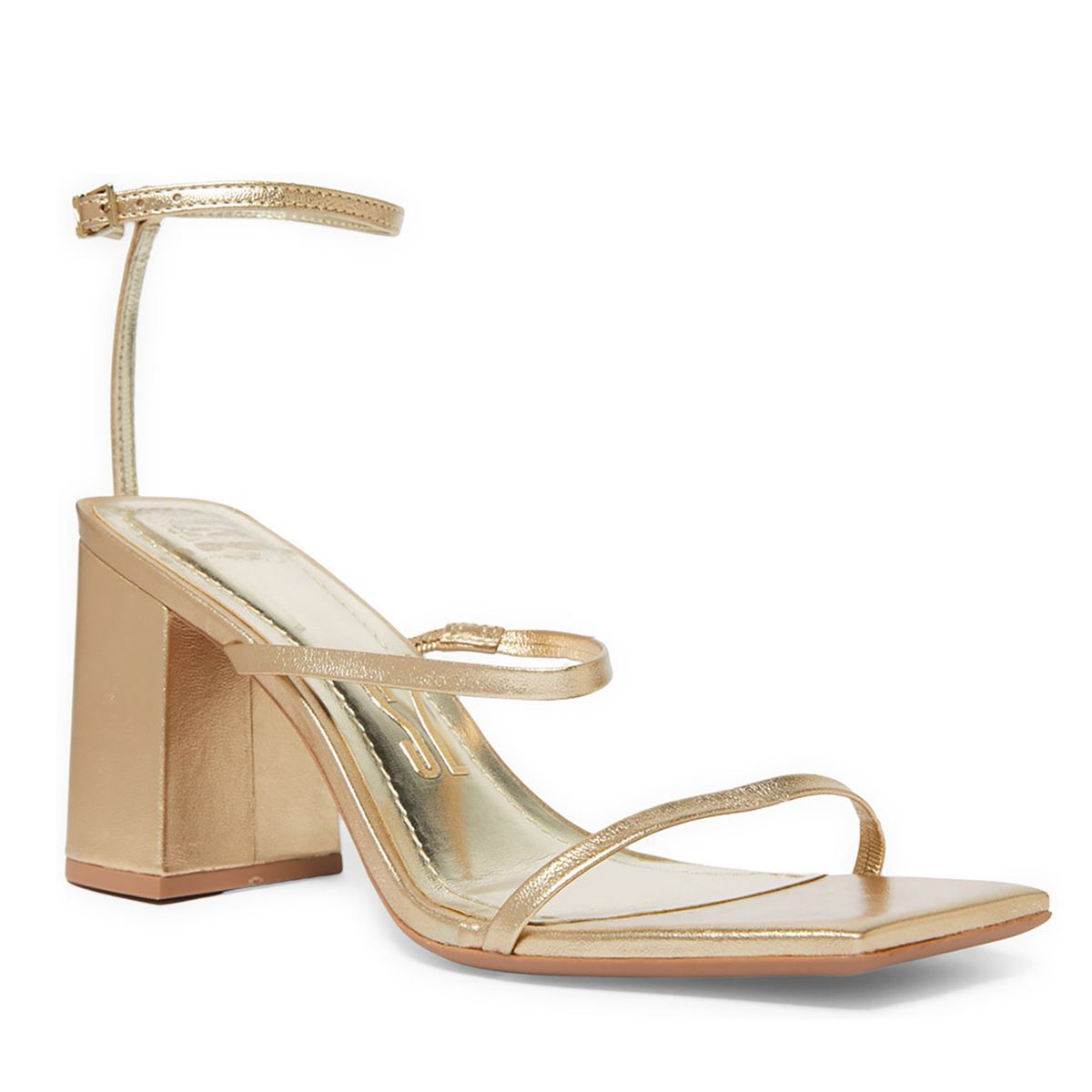 A sandália metalizada confeccionada em couro craquelê é um modelo que combina estilo e praticidade. Com bico quadrado e salto médio bloco, design inclui tiras finas e uma tira adicional que contorna o tornozelo, com fechamento em fivela proporcionando ajuste elegante.
