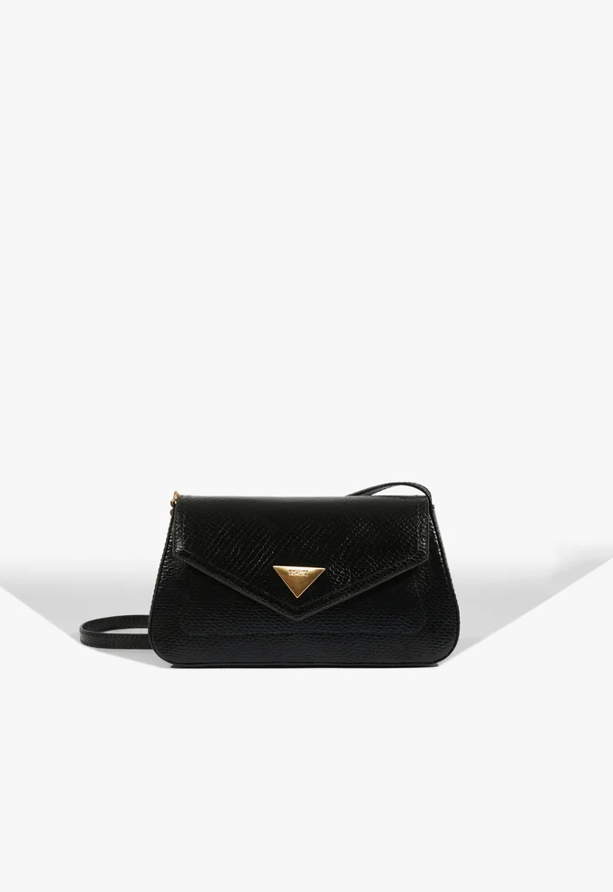 A bolsa preta feminina Liese é a união perfeita entre formato clássico e detalhes modernos. O shape envelope, o material liso e o acabamento brilhoso trazem um ar sofisticado, enquanto os pequenos rebites nas laterais e o fecho triangular em metal dourado adicionam um toque de atitude. Aposte! Comprimento da alça tiracolo: 55 cm | Largura da alça tiracolo: 1,5 cm.