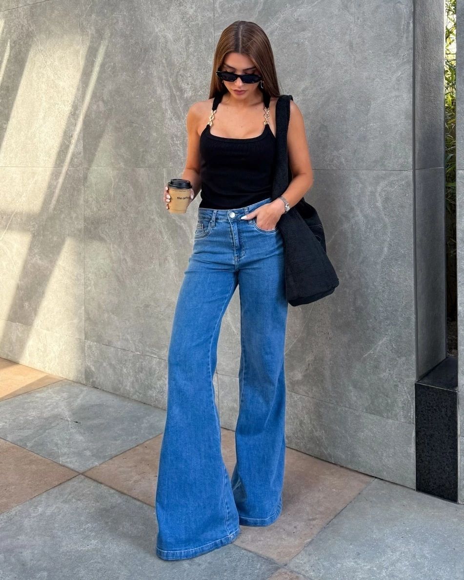 calça flare irais com lavanderia média, modelo essencial com detalhe de metal no bolso traseiro.